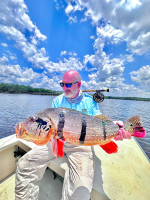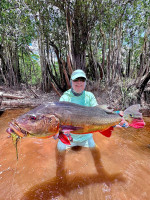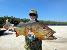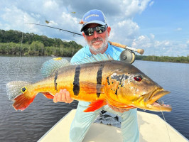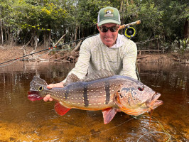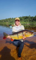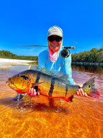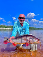 Highlights of the week: Paul Ridgway was fishing on a sandbar when he noticed a big fish there. Thinking it was a big peacock bass he made a perfect cast and the fight was on. To his surprise it wasn’t a Peacock bass, but a big stripped catfish called “Surubim”. Not an easy fish to catch on the fly. Congratulations Paul!
