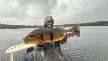 Rob: Tras ver a su compañero atrapar un gran ejemplar, tuvo su turno con un ataque violento que resultó en un tucunaré de 89 cm y 23 lbs.