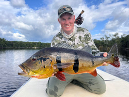 Durante la mayor parte de la semana, Alan había estado persiguiendo el sueño de pescar un pez trofeo. El último día, cuando el tiempo se acababa, finalmente tuvo su oportunidad. Después de fallar un primer golpe, se mantuvo concentrado y, cuando llegó el segundo golpe, lo logró. ¿El resultado? Un impresionante pavo real de 20 libras, una victoria ganada con esfuerzo para culminar una semana increíble.