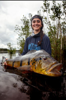 En su segundo viaje de pesca, Valentina, acompañada por su padre, se adentró en la selva amazónica dispuesta a aprender y divertirse. ¡Lo que no esperaba era que su primer pavo real fuera un gigante de 87 cm y 21 libras! Fue un momento de puro asombro y orgullo, que marcó el tono para una introducción inolvidable al deporte.