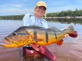 Jeff was casting at the lagoon bank when he saw a fallen tree. He cast, knowing that a big fish, if hooked, would break him off in seconds. Of course, the fish was there and acted exactly as we expected it would, heading straight for the trees. Having no other option, Jeff quickly closed the gap and jumped into the water, proceeding to carefully pass the rod under the tree and finally land his first peacock bass of the Marié River. Congratulations, Jeff!