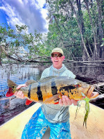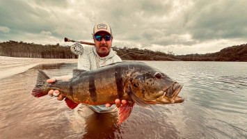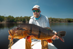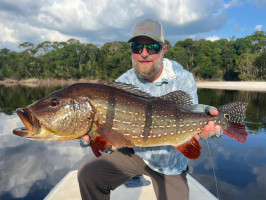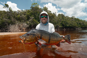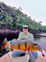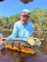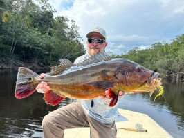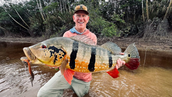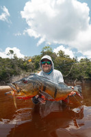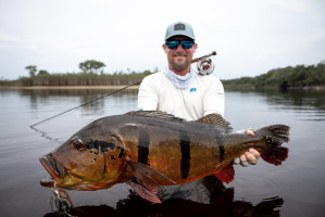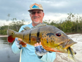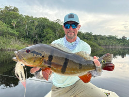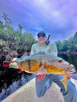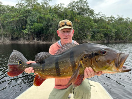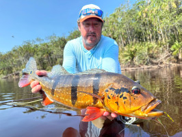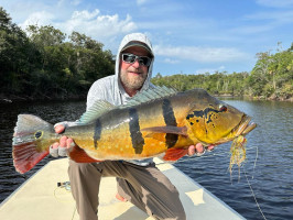 Jeff Massey was casting his fly catching Butterfly Peacock Bass, one after another. Out of nowhere, he saw a bigger mouth opening and swallowing his fly. It was nothing less than a 20lb+ Peacock Bass.