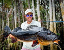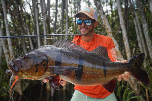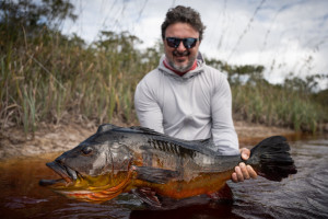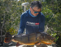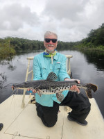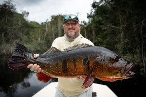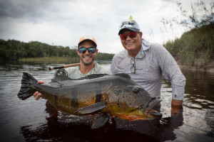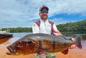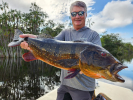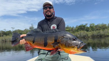 Week 19: Thiago, a self-taught fly fisherman with a rich history exploring various corners of the Amazon, honed his skills in peacock bass fly fishing on each expedition. However, the Marié River marked his first venture into a destination dedicated specifically to fly fishing for sizable peacock bass. The fusion of Thiago's natural prowess and the accumulated expertise of the guides over the years yielded an inevitable outcome. Soon enough, Thiago found himself in a thrilling battle with a colossal catch., Thiago wasted no time plunging into the water, accompanied by his native guide. After an intense chase and navigating through the thick vegetation, Thiago triumphantly secured his coveted 23lbs Giant Peacock Bass of the Marié River.
