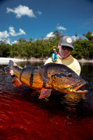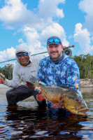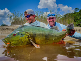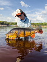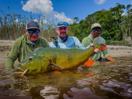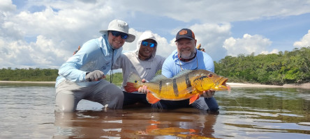 A medida que el sol se alzaba sobre el Río Marié, la anticipación de los pescadores también aumentaba, sabiendo que estaban en presencia de los tucunarés más grandes del mundo. Esta es la esencia de la experiencia de pesca de trofeos, reservada para quienes buscan no solo aventura, sino el pináculo de la pesca con mosca. A pesar de un inicio lento debido a los bajos niveles de agua y las temperaturas muy cálidas, los pescadores rápidamente se adaptaron, encontrando su ritmo y desafiando a los gigantes del río. La exclusividad del Río Marié no solo se define por su belleza remota, sino también por las batallas inigualables que ofrece—donde 4 líneas de mosca rotas y 5 líderes de 60 libras rotos son parte de la recompensa de esa codiciada foto con un monstruoso Temensis. Los pescadores persistieron, imperturbables, y fueron recompensados con capturas inolvidables que dejaron una marca duradera.