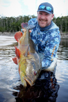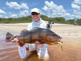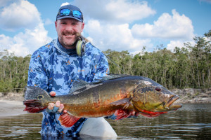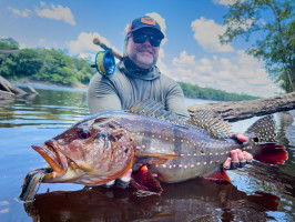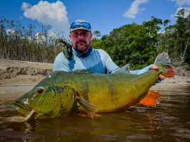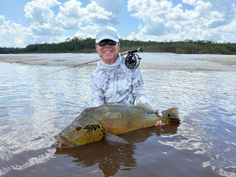 Ryan, un principiante en la pesca con mosca, descubrió tanto los desafíos como las recompensas de las aguas del Río Marié. A pesar de nunca haber usado una caña de pescar con mosca antes, se adaptó rápidamente con la orientación de guías locales experimentados. Su perseverancia dio sus frutos cuando capturó un impresionante tucunaré de 18 libras—un logro que sería el punto culminante de cualquier viaje de pesca. Pero la emoción no terminó ahí. En una tranquila laguna, un colosal ataque en la superficie de su popper reverberó por el agua, señalando una de las explosiones más grandes vistas en el Marié. Manteniendo la calma, Ryan y su guía controlaron cuidadosamente el pez, logrando finalmente capturar un tucunaré monstruoso de 91 cm y 24 libras, estableciendo un alto estándar para las próximas semanas.