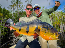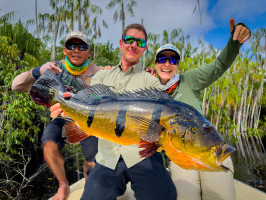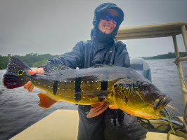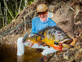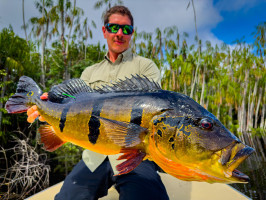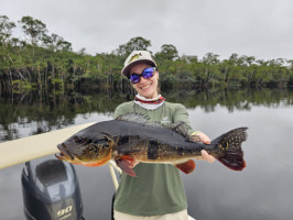 Paolo – El Ataque de Popper de una Vida Las aguas altas no disminuyeron el espíritu de Paolo. Guiado para lanzar su popper en un saliente sumergido, observó con asombro mientras la selva explotaba con un ataque atronador. Un enorme Tucunaré inhaló su anzuelo, y la lucha comenzó. Con habilidad y calma, Paolo luchó con el pez en una intensa batalla, finalmente capturando un trofeo impresionante. Atrapar un Tucunaré con un popper siempre es especial, pero hacerlo bajo condiciones tan difíciles elevó el momento a un nuevo nivel.