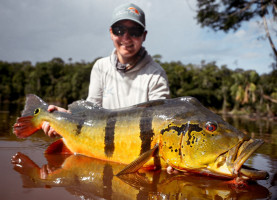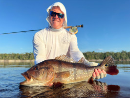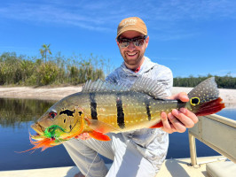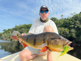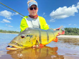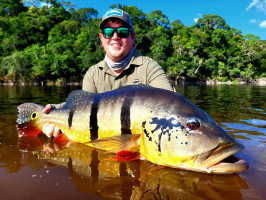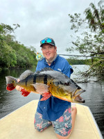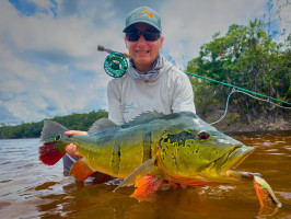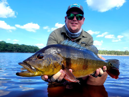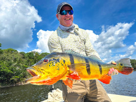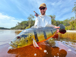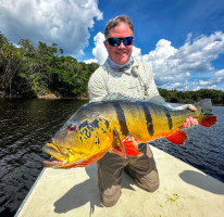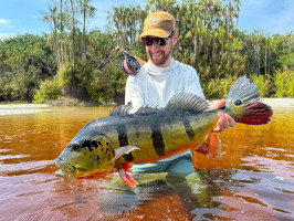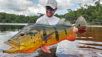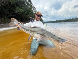 Después de haberse unido al club de los 20 libras con un enorme pavo real de 21 libras, la semana de Mitchell parecía estar completa, pero Rio Marié tenía una última sorpresa guardada. El último día, mientras pescaba en un arroyo escondido, Mitchell sintió un poderoso ataque. Mientras trabajaba para recuperar el control, él y su guía José se sorprendieron al ver un gran bagre surubim subir a la superficie, ¡una captura rara y desafiante con mosca! Felicitaciones a Mitchell por un final extraordinario para su aventura en Rio Marié.