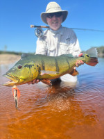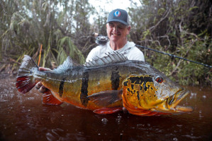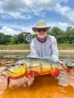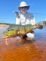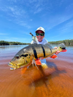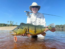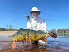 Renne Marie llegó preparada para su tercera aventura de pesca con mosca, equipada con un intenso entrenamiento previo al viaje, que incluyó una innovadora sesión de práctica con una silueta de un pavón atada a un automóvil a control remoto, una creación de su amiga Amanda Willshire. En un excelente día de pesca, Renne se enfrentó a un pavón colosal, que atacó cerca del bote y, en un instante, comenzó la pelea. Siguiendo con calma las instrucciones de su guía, trabajó con destreza el poderoso pez hasta que finalmente se rindió: un impresionante pavo real de 87 cm y más de 20 libras que ejemplifica el verdadero espíritu de Rio Marié. Felicitaciones, Renne, ¡has establecido un nuevo estándar!