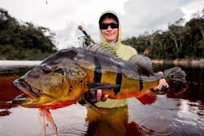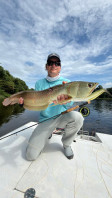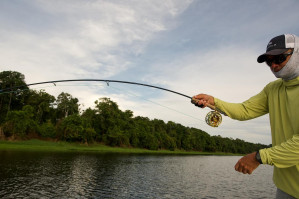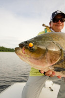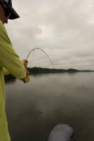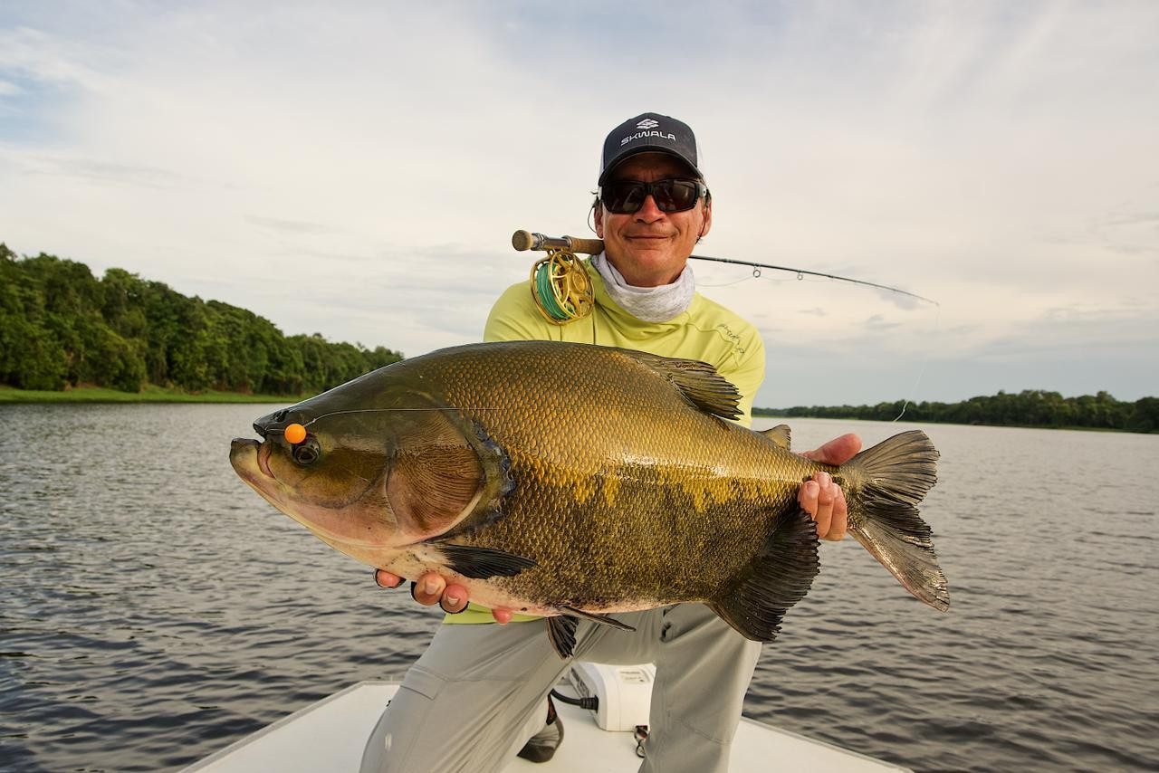 DAY FIVE: TAMBAQUI AND ARAWANAI start each fishing morning sitting on the covered floating porch. No one stirs around the lodge until 5:40ish, so I have time to watch this section of Brazil wake up. By 6:00 the coffee is ready and I've made a friend of a midsized yellow-breasted bird that I exchange whistles with until he tires of the banter and flies away. That bird is like clockwork. It's a good way to start the day.Today was something different—the morning session was focused on Tambaqui. Changing back to a 9 weight rod was like fishing with a feather. The lure is an orange ball and a hook. If you throw it properly it makes the sound of a musical note when it plops in the water. The key to catching the Tambaqui is you play it a song. You land the ball lure softly three times in the same place. The three drops of the lure make the song. At first I thought it was a tall tale, but sure enough it calls them to the lure.The day of fishing was great. In the morning session I caught a solid fish around 12 pounds and multiple 3 to 6 pound fish before heading into lunch. The schedule here takes me back to kindergarten—you get breakfast, they give you instructions and you go out to recess. Then they bring you for lunch and a nap. Then back out to recess. Who wouldn't love this schedule?The afternoon session brought muddy edges from the afternoon rain and the arawana were very hard to find, so we switched back to fishing for the Tambaqui. Several hookups, great tug of war sessions. Then it happened, a giant Tambaqui. The bite was soft but I set the hook into a monster that went into a full run. The reel was screaming and the line was fast dumping off the reel. I was finally able to gain some line back to the reel only to see his powerful run strip all that was gained. In time I was able to get the giant close to the boat. Once by the boat he still would not give up for several more minutes until finally I turned him and rolled him into the net. A true goliath for the species in these parts—19 and a half pounds of hard-fighting fish. A testament to what these waters produce. We quickly took our photos, allowed him to rest, then released him back to fight again another day.