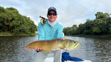 DAY THREE: THE SHOWThe day started right out of the gate in the morning session. Another arapaima, this one 178 centimeters. He came up breaching, full-body explosions that seemed almost vindictive. The head-shaking jumps were spectacular and exhausting—nature putting on a show for an audience of monkeys, birds, and a couple of guys in a boat. Long hours of slow stripping and casting while observing the pink dolphins breaching and being serenaded by the distant howler monkeys. All while fishing under the watchful eyes of the caimans.