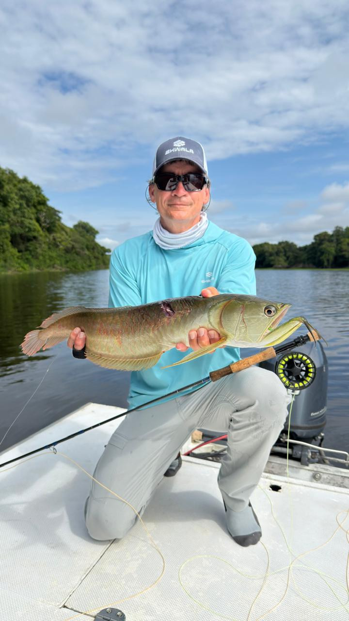 DAY SIX: THE FINAL QUESTOur quest for the final day was the only fish I hadn't caught—a true trophy arawana, something picture-worthy. I thought it would be an easy day. The heat had other plans. It built quickly as the sun rose over the trees, sweat came instantly, the jungle reminding you that comfort is temporary here.The cure for all of it was the arawana fishing. The kind of fishing that makes you forget about heat and sweat entirely. This was sight fishing—fast, full of action, entertaining in a way that keeps your attention sharp. You watch the surface, spot the fish, make the cast, repeat. The rhythm is urgent where arapaima fishing is contemplative. No patient strip and watch, no meditative casting into the unknown.I caught arawana of all sizes through the morning. Then on the last cast before moving on, I hooked the one. The fish was near a tree that had fallen into the river, and he knew exactly where to go. Line stripped from the reel as he headed straight for the tangle of branches. We maneuvered the boat, trying to clear the fish from the tree, but he was faster. The giant wrapped the line several times around a branch near the surface. We moved quickly into position, freed the tangled line, and brought the great fish to hand. A trophy specimen, the kind you travel for.