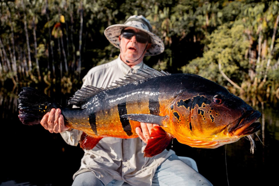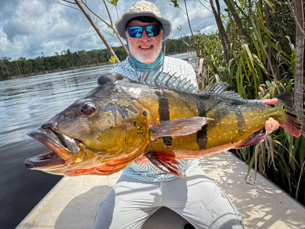 Greg experienced one of those strikes that stays etched in memory. A violent surface take on a popper left no doubt about what followed, and moments later a 21 lb peacock bass was safely in the net. A classic Marié moment, raw and unforgettable.