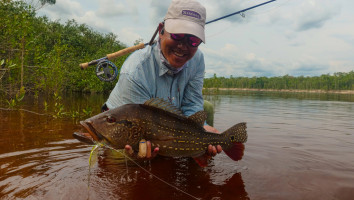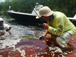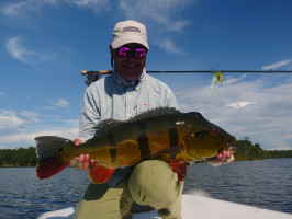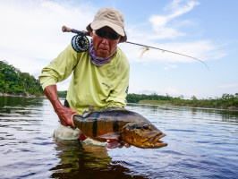Dr. Meng Son recently made his way to the "River of Giants" and documented his trip with a great journal and some excellent imagery. His journal: The Amazon is the largest drainage system in the world responsible for almost 20% of the entire worlds fresh water discharge into the ocean. The Rio Marie is a tributary of the Rio Negro River which is the second largest Tributary of the Amazon River. Three years ago Untamed Angling built ?the Untamed Amazon? to navigate and fish 500 miles of the Rio Marie and it?s 60 lakes and 180 tributaries. Only accessable by float plane, the mother ship with its navy of custom made 21 foot skiffs, fish virgin water by moving up? river daily covering around 500 miles of prime Peacock Bass habitat. The Untamed Amazon can generate 100% of its electrical power from its own solar cells and batteries. Imagine having 24 hour electricity, hot showers, daily laundry service and internet on one of the most remote rivers in the world. It is perhaps the most unique fly fishing vessel of its kind and the food and accommodations are amazing. This trip ranks as one of the best fishing expeditions Ive ever taken. Steve and I were lucky enough to fish with some great anglers this week. Along with long time fishing friends, Victor, Judy and John Leonard, We got to fish with Michael Michalak (owner of the Redding Fly Shop) and two great new friends ? Joe and Juan. Together we landed 531 Butterfly Peacocks and 47 Temensis (Giant Peacock bass GPB). Of the nearly 50 GBA we caught, 11 were 10-15 lbs, nine were from 15 to 20lbs, and three were over 20 lbs. The largest one caught this week was 25 lbs , just 3 lbs off the current terminal tackle world record. It?s easy to get caught up in ?Giant? fever when you are here because there is a lot of talk about the next world record. Even the guides seemed to set the ?Big Fish Bar? at plus 20 lbs and dont get too excited about sub 20 lbrs. We only managed three all week and two were caught by John Leonard out of 8 anglers. Everyone got some fish this week over ten lbs which is realistically an amazing stat in itself. For me, it was about comparing the experience to a good day of striper fishing since it was my first experience fishing for Peacocks. A bad day of fishing for Peacock bass is better than a good day of Striper fishing on San Luis. Even with gloves, tape and stripping guards, I got line cuts through my protection. These are truely brutal fish (my favorite). The main classes of fish that are caught are the Butterfly Peacocks (Cichla orinocensis) which average 3-10 lbs and feature three distinct ocelli (Butterfly like markings) along its sides. They fight like San Luis Stripers on Steroids. The Cichla Temensis is the Giant of Peacock bass. They spawn in beds in the river holding there young in there mouths. When they get large, these lose their spotting and develop three black bars down their orange brown flanks. In this spawning state they are known as ?Acu?. This same species can go into a non spawning state know as a Paca-Asu. The Paca don?t reproduce and focus on hunting and eating. The Paca are stronger and more vicious because of the lack of reproductive distractions. They are differentiated by purple blue flanks with white spots. On an average day, Steve and I put 20-60 fish to the boat and I can truthfully say that these fish hit harder and pull harder that stripers the same size. Over the last 6 weeks, anglers are getting on average 2-3 shots a day at large GPB or Paca?s. Not only are they an awesome fish to hook on Streamers and Poppers, they are beautiful fish with no two the same. My biggest fish of the week was caught on the first day on the next to last cast of the day at 15 lbs. The monster hit my 5/0 streamer 3 feet off the bank and made a run for timber like a Lingcod for rocks, It was everything I had on my 8 weight to turn it and my running line cut through my finger tape like butter giving me a nasty line cut on the first day. Not to underate them, but like really big stripers, big peacocks are good for two or three great runs and then they give up. No one I talked to fought the big ones into backing. John Leonard who has been to the Rio Marie 4 times caught most of the large fish. His 25 lbr was caught on his now perfected technique of free drifting a Popper five feet from the boat while contemplating cutting the fly off. Victor, one incredible fly fisherman, caught an unusual 20+ lb Paca which the guides say fight harder than a 25 lb GPB.? A 20 lb Paca is a rare fish indeed and I heard a few guides say its the biggest one they have ever seen. The travel to the Amazon Explorer is arduous. We left San Jose on a 5 hour redeye to Charlotte. From Charlotte we headed to Miami and on to Manaus. The total travel time with layovers was 24 hours. The next day we took a 4 hour float plane to the mothership and didn?t start fishing till the next day. You would think that I would be use to this kind of travel after two Bolivia Amazon trips this year but it?s getting harder and harder to sleep in airplanes for me. I need some special pillows for the next trip. You need to get a Brazilian Visa 6 months in advance and a yellow fever Vaccine. The boat is awesome- even better than Bolivia?s luxury lodge. We were delighted with the full picture window, air conditioned, double occupancy rooms with hot showers, The main socializing room has a beautiful lounge and dinning area as well as a outdoor lounge area with jacuzzis and a rear viewing deck. The food is excellent and the laundry service is fast and good. The Laundry service was so fast and efficient that you could bring only one set of clothes to fish in and they would be cleaned every day on time for the next morning. Which is what Mike Mitchell had to do since his luggage did not make it to Manaus on time. Mike ended up fishing the week on donated fishing equipment and underwear. There is 24 hour electricity. One of our group was able to use his CPAP machine every night